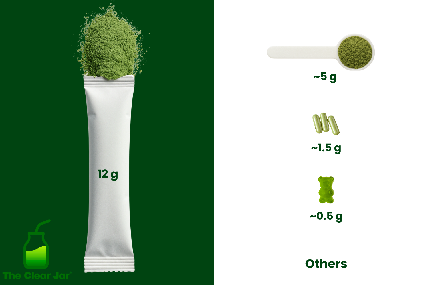 Many greens brands promise big benefits but provide only 5 g of real greens—sometimes even less. Each of our sticks delivers 12 g of raw, nutrient-dense greens, equal to 2.5 cups of fresh greens.